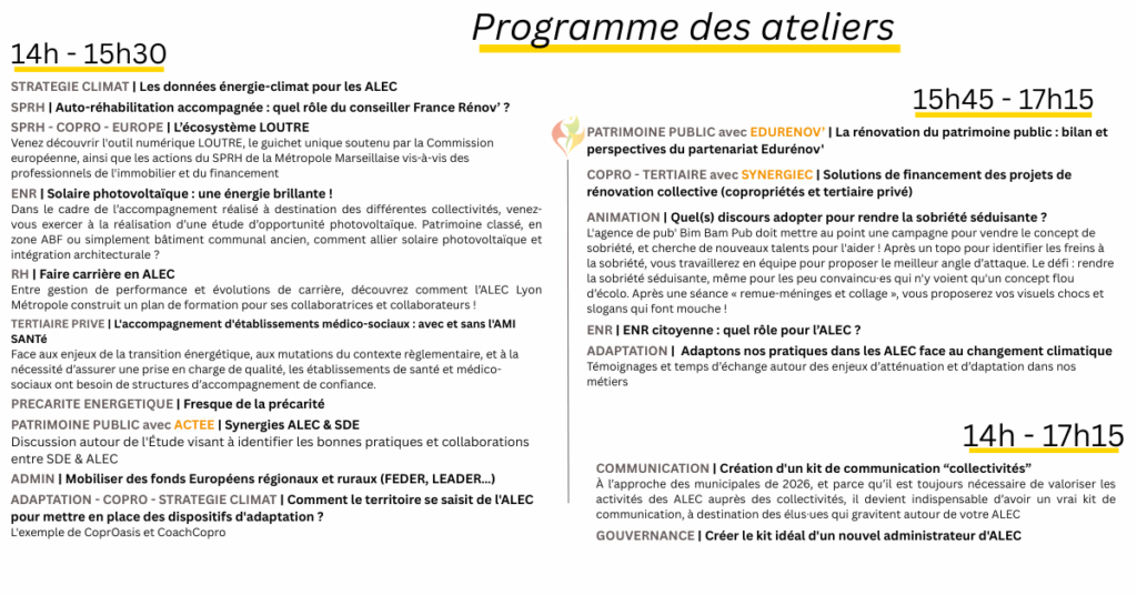 Cette année, les partenaires ont également eu l’occasion de porter un atelier, en collaboration avec une ALEC afin de se faire mieux connaître de nos équipes. C’est le choix qu’on fait le Programme de la Banque des Territoires Edurénov, Synergiec et la SASU FNCCR avec laquelle nous sommes revenus sur les coopérations heureuses entre SDE et ALEC !